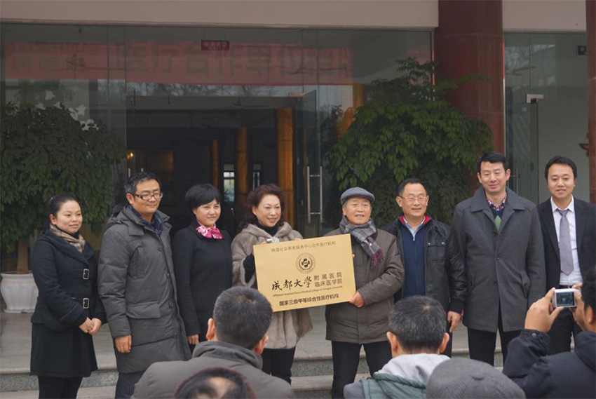 成都大学附属医院的汪院长就这次授牌仪式的活动也发表了讲话,汪院长的每字每句都说到我们老人的心里去了,汪院长的一番话让我们的老人对他们的晚年生活增添了一份新的保障,也对我们以后的工作的开展增加了新的动力。一段热情洋溢的讲话后就是让在场的所有人**激动的时刻就是——授牌,当成都大学附属医院的汪院长和杨院长将“合作之牌”送到白主任和毛爷爷手中时,所有人脸上露出高兴的笑容,还拍手欢呼着口里还不停的倒着好!好!好!